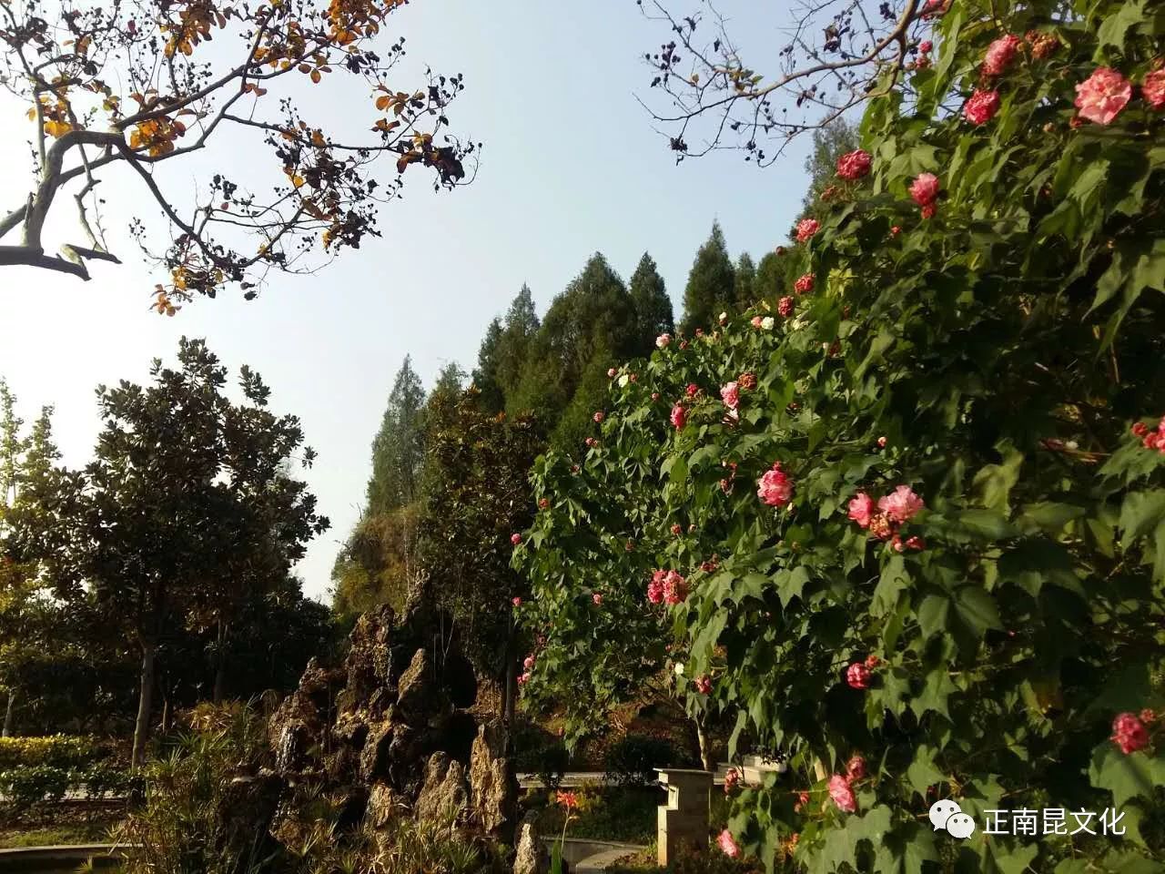 芙蓉花旁的假山掛著清涼的水簾,