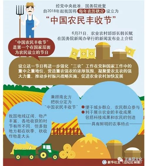 ? ? ? ? 近日,經黨中央批準、國務院批復,自2018年起,將每年農歷秋分設立為“中國農民豐收節”
