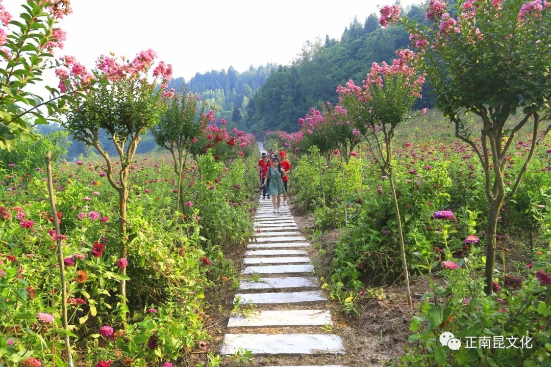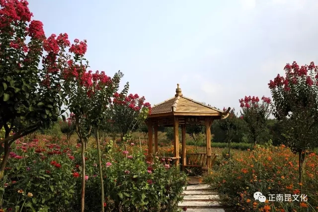 走過(guò)湖泊,劃過(guò)皮艇,經(jīng)過(guò)“百善孝為先”廣場(chǎng),爬上云梯頂,看到站立在忠義廣場(chǎng)的“莊子”;走過(guò)李子林,穿過(guò)桃林, 再到百花園, 滿(mǎn)園的清新空氣,讓人感覺(jué)身體都輕飄飄的。前面就是紫薇花園,主人王新在前面帶路。只見(jiàn)石板路兩邊的紫薇花開(kāi)得正濃,有淡粉的,紅粉的,一簇簇向外伸展,一陣陣香氣撲鼻而來(lái)??吹阶限被ǎ胰杂行┬挠杏嗉虏桓矣|碰,可紫薇花們卻個(gè)個(gè)伸出手臂,輕撫我的臉頰、 頭發(fā)……那柔柔的撫摸和濃濃的香味,讓我忘卻了對(duì)它的芥蒂。